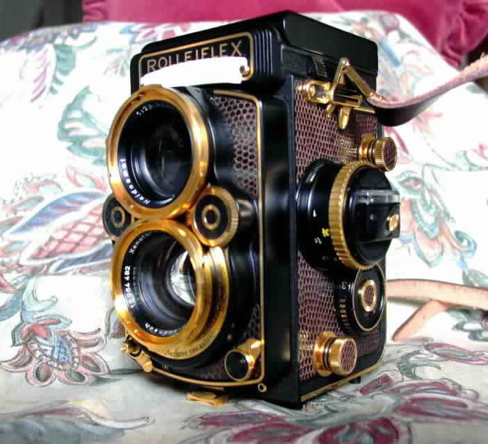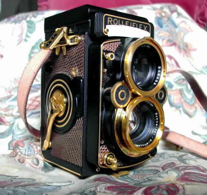 - ROLLEIFLEX 2,8 F AURUM ( Zweiäugige Spiegelreflexkamera): Bj.1983; Format 6 x 6; Objektiv: Schneider " Xenotar" 1 : 2,8/80 mm -